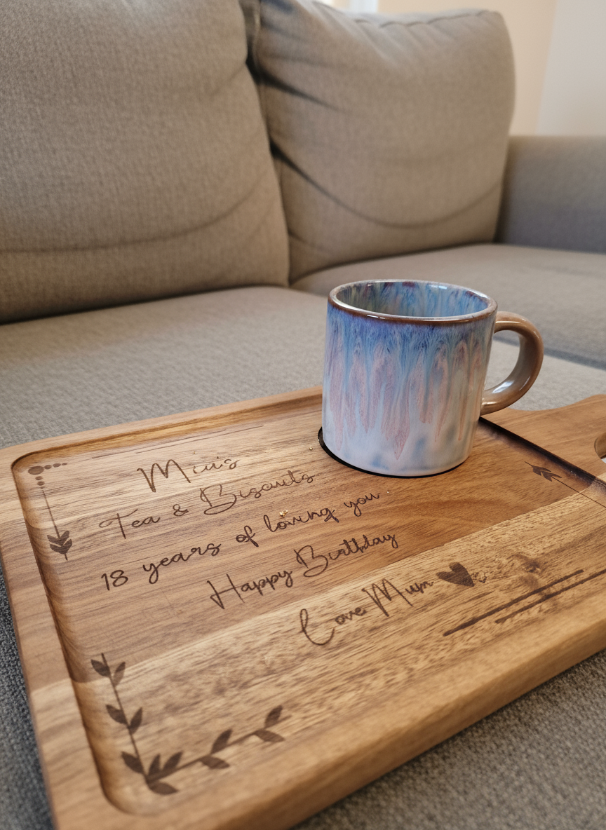 The smooth wooden surface includes a dedicated space for your biscuits (or cake slice, we won’t judge), and is elegantly laser engraved with any text of your choosing for a timeless, homely touch.